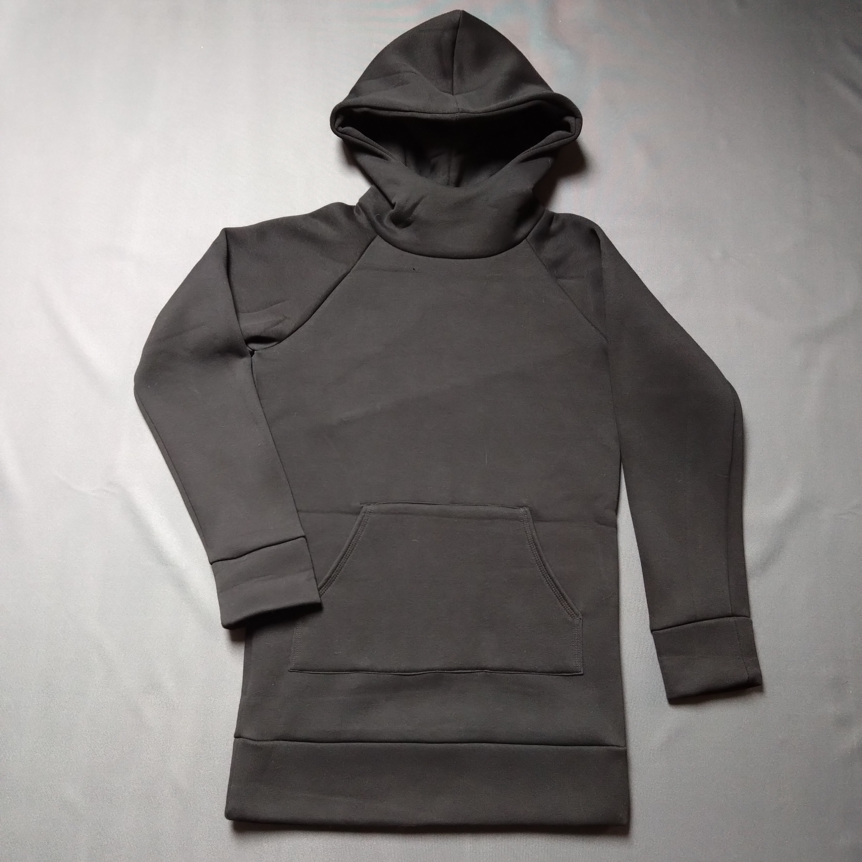 Bluza z czarnej dresówki drapanej. Kieszeń z przodu, obszerny kaptur. Krój uni, czyli dla każdego. Bluza jest długa i ciepła.